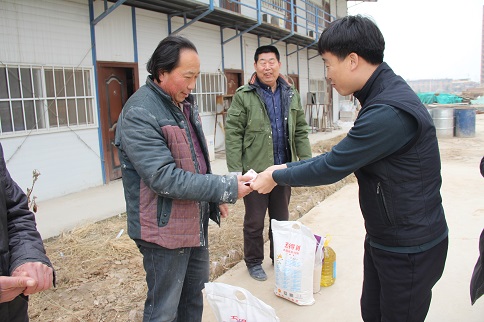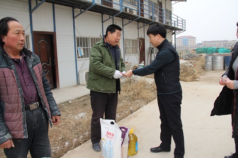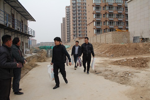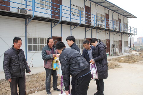 陳朋飛同志充分肯定了大家對公租房建設所做的貢獻,他說:“你們是公租房建設的功臣,是你們的智慧和力量,是你們長期以來的辛勞付出,這一座座高樓才得以拔地而起,我代表公司黨支部感謝你們!”隨后,陳朋飛同志代表公司黨支部將大米、白面、食用油等慰問品和500元慰問金分別送到三名農(nóng)民工代表薛敬軍、魚明星和陳新院的手中。